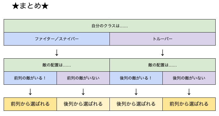- ファイターとスナイパーは、クラス補正(1.25倍)の乗る前列の敵を優先して攻撃